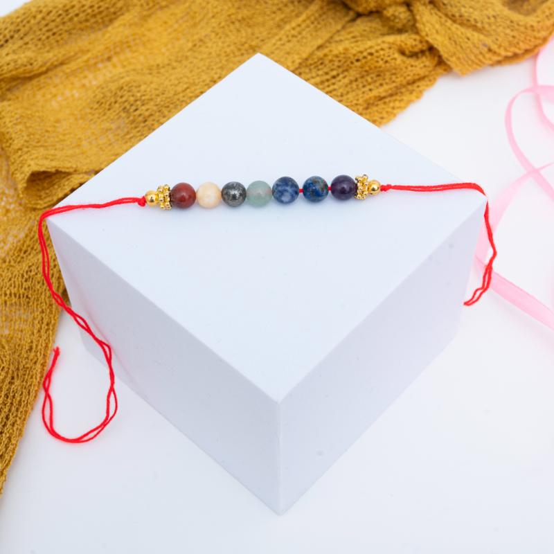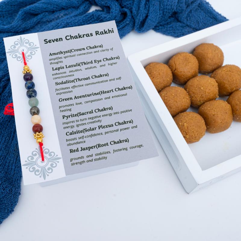 Gift your brother the essence of well-being with our Vibrant Chakra Harmony Rakhi. This truly unique thread features seven distinct, colorful stones or beads, each representing one of the body''s energy chakras. It''s more than just a rakhi; it''s a symbolic blessing for balance, vitality, and alignment in his life, promoting positive energy and overall well-being. This meaningful and beautifully designed rakhi is thoughtfully paired with 400gms of traditional, melt-in-your-mouth Besan Laddus, offering a rich, sweet indulgence to perfectly complement the spiritual sentiment. A complete and unique gift for a truly special Raksha Bandhan.
