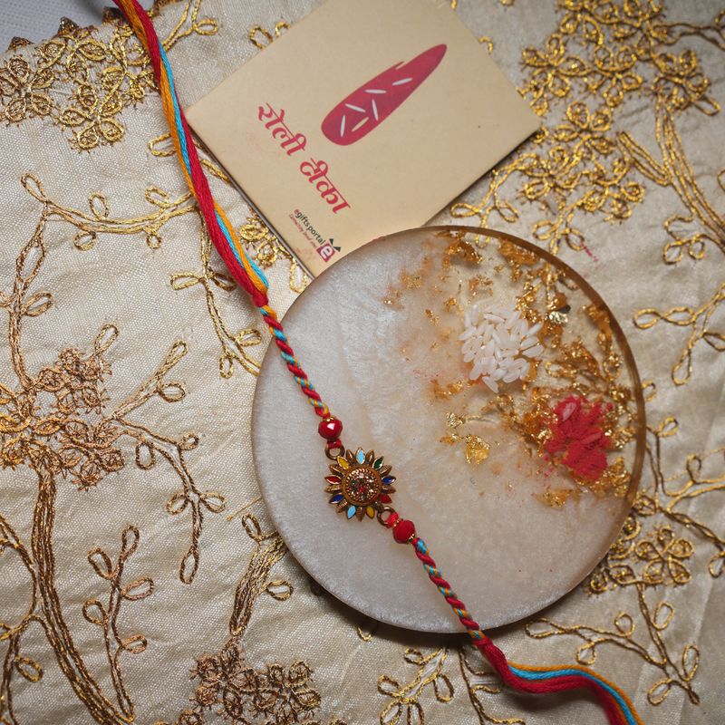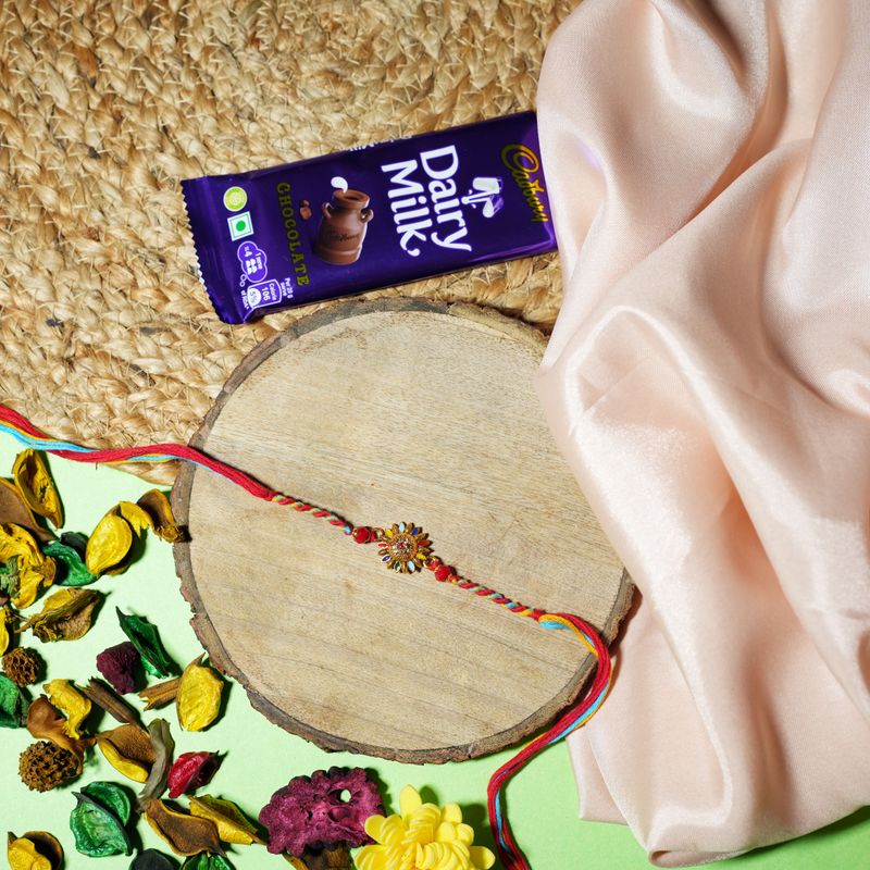 Embrace the festive spirit with our Vibrant Charm Rakhi, adorned with colorful threads and beads, paired beautifully with creamy Dairy Milk chocolates. Perfect for celebrating the bond of love and sweetness.