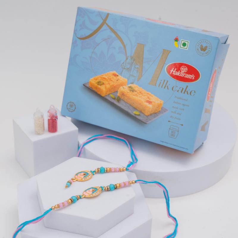 Celebrate the rich tapestry of your bond with our Vibrant Ethnic & Sweet Indulgence Rakhi set! This exquisite Bhaiya Bhabhi Rakhi pair features a burst of colorful ethnic designs, meticulously crafted with traditional motifs and vibrant threads. Each detail speaks of cultural heritage and the joyous spirit of Indian celebrations, making them a truly unique and eye-catching tribute to their relationship. The Bhaiya Rakhi boasts an intricate design, perfectly complemented by the elegant matching Lumba for Bhabhi. To sweeten this festive occasion, we’ve included a generous 340gms of rich, traditional Milk Cake, ensuring a delightful and melt-in-your-mouth experience. It''s a perfect blend of artistic tradition and delectable indulgence, promising a memorable and joyous Raksha Bandhan for your beloved Bhaiya and Bhabhi.