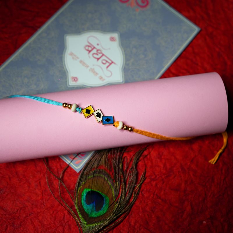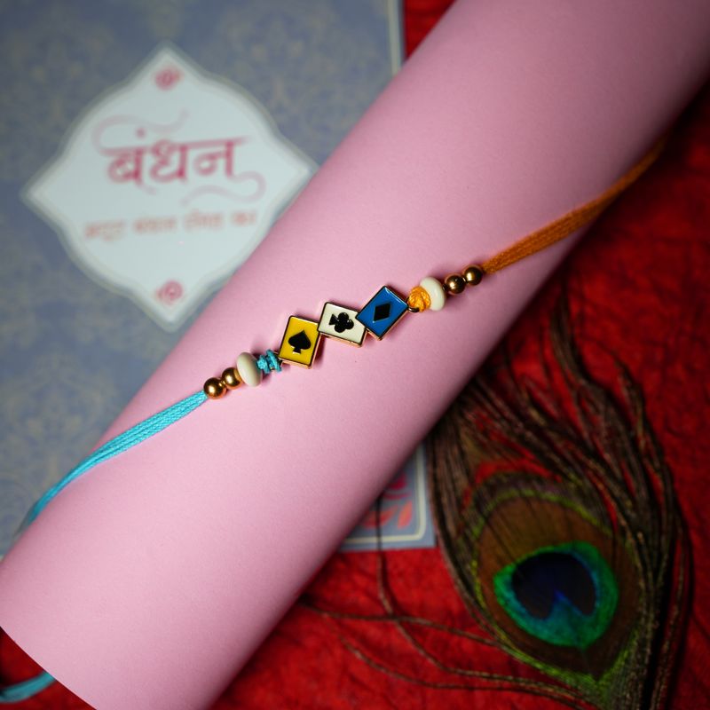 Celebrate Raksha Bandhan uniquely with our Whimsical Cards Rakhi, a blend of tradition and modernity. This exquisite Rakhi features delicate card motifs adorned with vibrant colors and intricate details, perfect for expressing your love and affection to your beloved sibling.