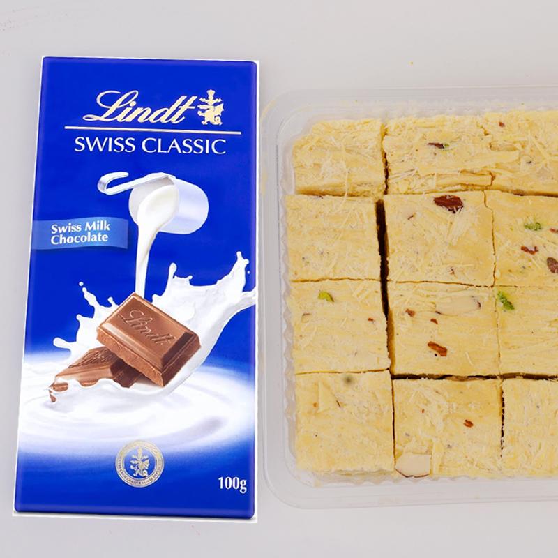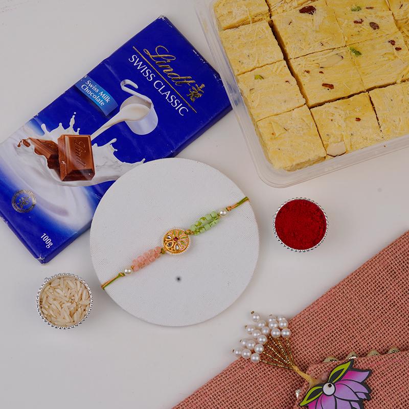 Adorn your brother''s wrist with our Whimsical Handcrafted Rakhi, a truly unique piece that celebrates artistry and heartfelt affection. This distinctive rakhi features an intricate, one-of-a-kind design, meticulously created by skilled hands using a blend of traditional techniques and artistic flair. It''s more than just a thread; it''s a wearable piece of art, symbolizing the unique and special bond you share, reflecting care, creativity, and thoughtful effort. This beautiful token of your affection comes perfectly paired with a luxurious Lindt Creamy Bar, offering a smooth and delightful chocolate experience. Adding to the sweetness, 250gms of melt-in-your-mouth Soan Papdi, a light and flaky traditional sweet, completes this delightful assortment, making his Raksha Bandhan truly memorable and sweet.