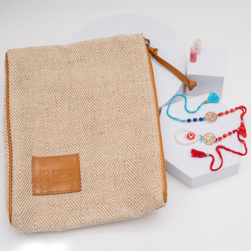 Adorn your Bhaiya and Bhabhi this Raksha Bandhan with our unique "Wishful Protection" & Vanity Essential Rakhi set. This captivating pair features a fusion of traditional symbolism with modern design. The central motif showcases a delicate wishing tree, symbolizing growth, prosperity, and the fulfillment of desires, beautifully intertwined with the protective charm of the evil eye, believed to ward off negativity and bring good luck. Crafted with meticulous detail, the Bhaiya Rakhi boasts a sturdy design, while the accompanying Lumba for Bhabhi dangles gracefully, echoing the same meaningful elements. Adding a thoughtful and practical touch, this set includes a stylish vanity pouch. It''s perfect for your Bhabhi to store her makeup and essentials, keeping her organized and chic, whether at home or on the go. This Rakhi set is a truly thoughtful combination, blending protective blessings with an elegant and useful accessory for a memorable and joyous Raksha Bandhan celebration.