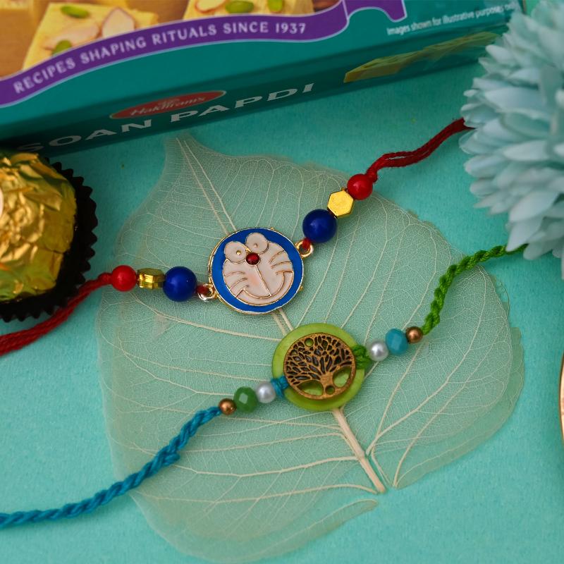 Celebrate Raksha Bandhan with blessings, joy, and sweetness through our Wishing Tree & Doraemon Rakhi Set with Soan Papdi & Ferrero Rocher. Featuring a symbolic Wishing Tree rakhi for your elder brother and a fun Doraemon rakhi for the little one, this combo is perfect for siblings of all ages. Paired with 5pcs of Ferrero Rocher and 250gms of flaky Soan Papdi, this set brings spiritual meaning and playful charm—ideal for sending love across India or to the Australia.